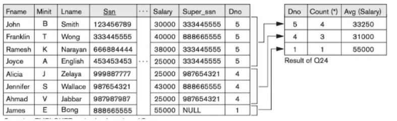 SELECT Dno, COUNT (*), AVG (Salary)